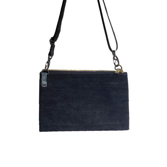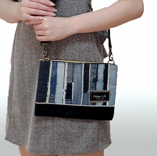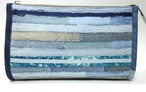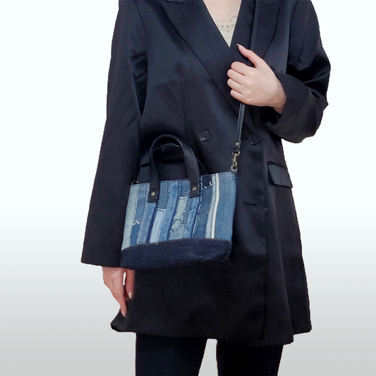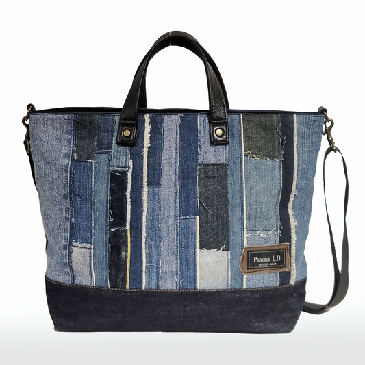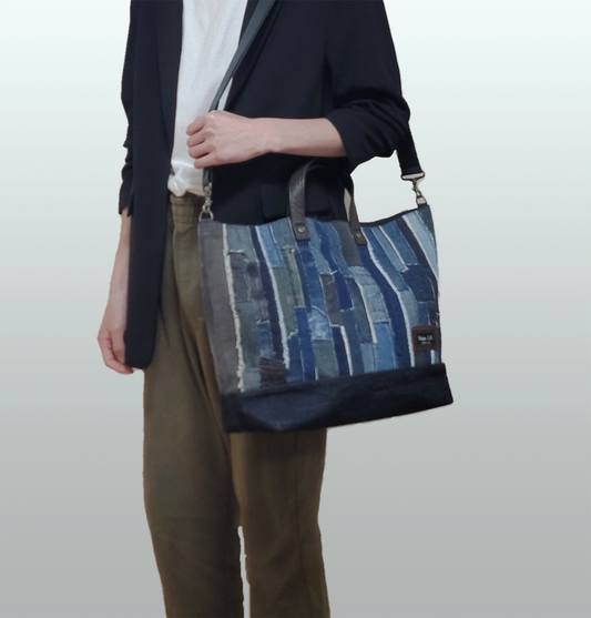 北海道の海と沖縄の海の青をイメージしたグラデーションを表現。古着のジーンズを、選別し、解体し、手入れをしてから縫い合わせて一枚の生地に。ひとつひとつ丁寧に。ほつれもデザインに取り入れ、生地を5回以上重ねて縫う。職人がひとつひとつ手をかけ、時間をかけていく、非常に手間のかかる工程を経て作られています。